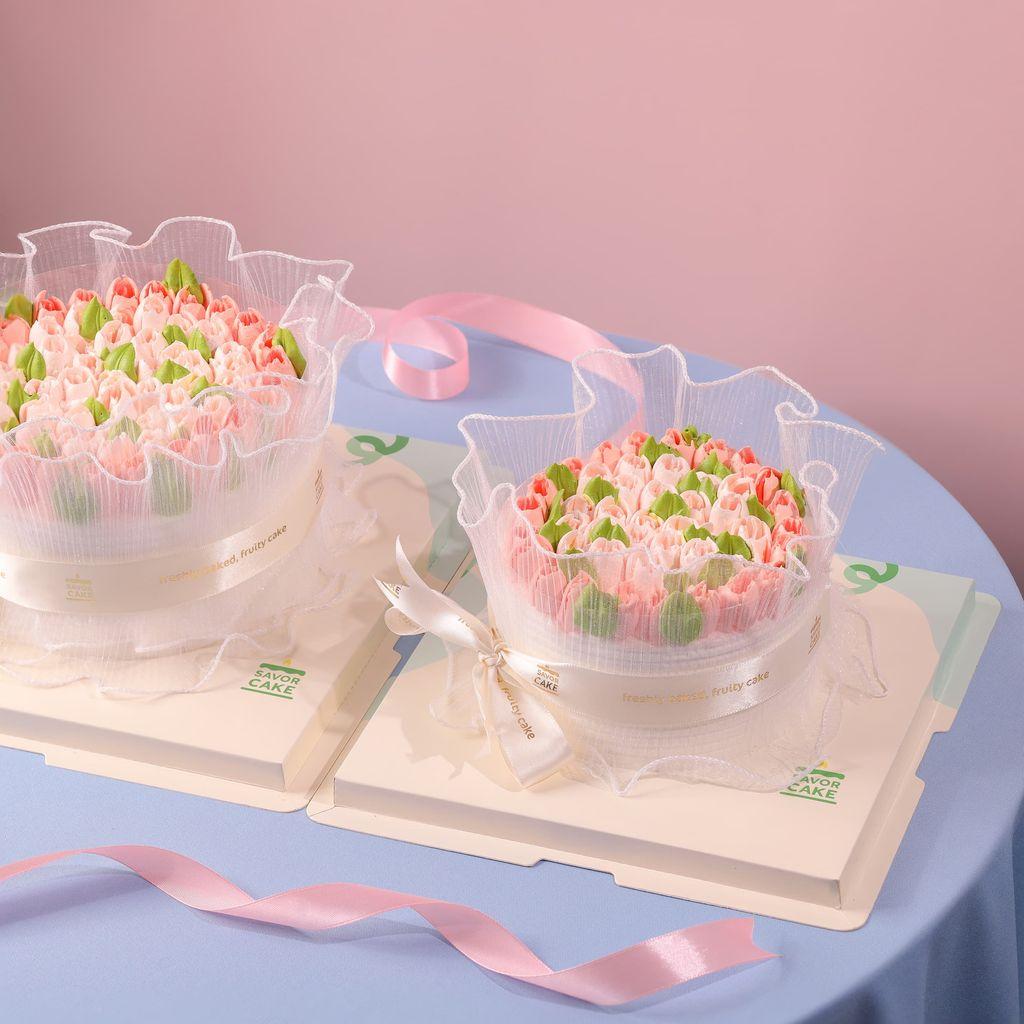 Bánh kem tulip với cốt vani, mứt xoài, nhân xoài dứa và kem trắng, kết hợp cùng với lớp voan trắng vô cùng mềm mại tạo thành một bó hoa với sắc hoa hồng cam