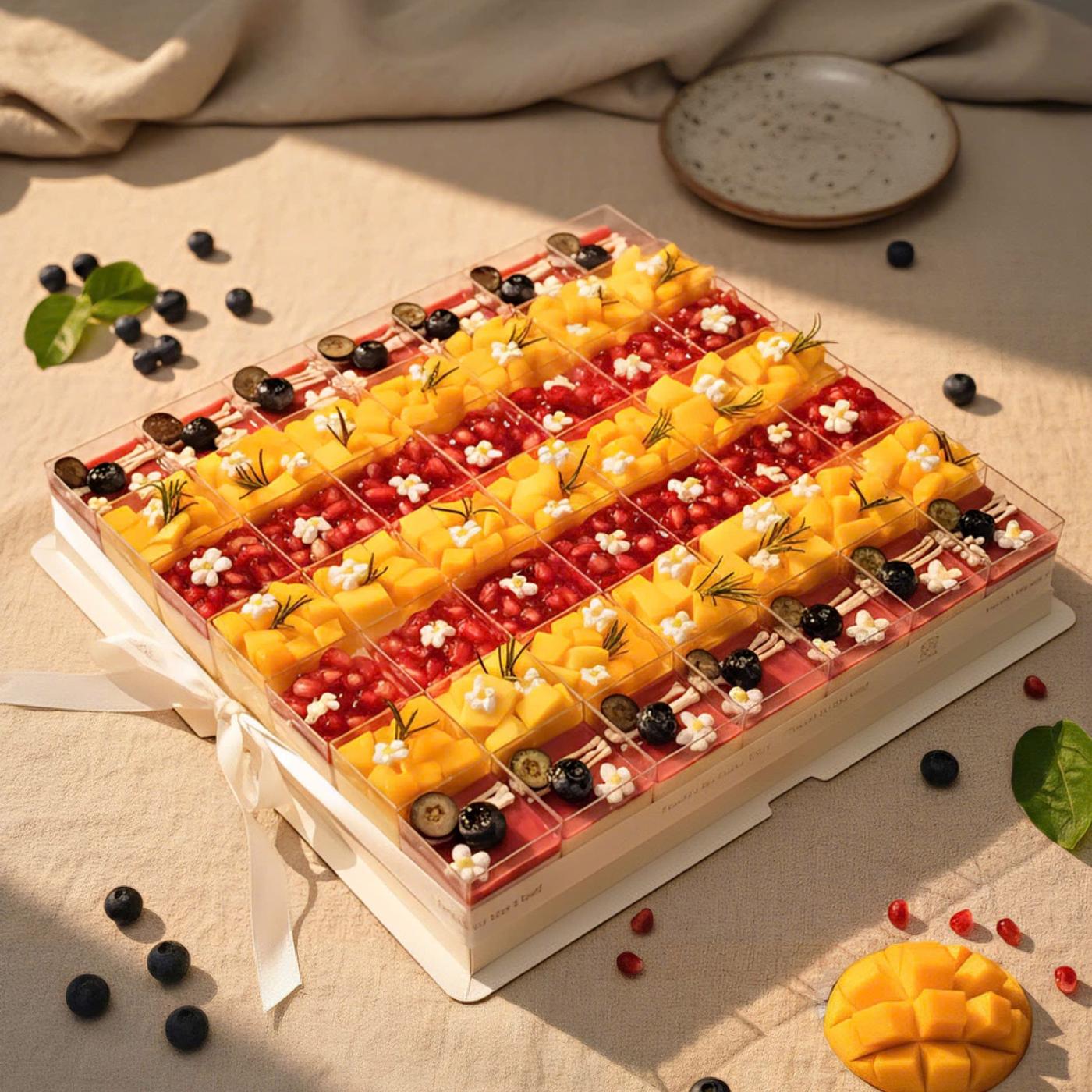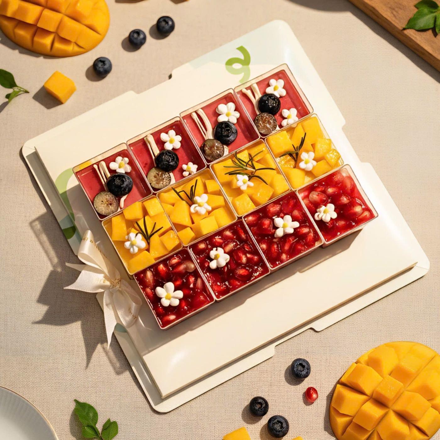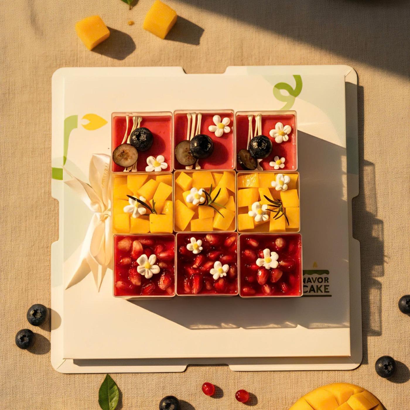 Set gồm các vị mousse: 3 xoài - 3 việt quất - 3 sữa chua. Trang trí với các loại hoa quả tươi: xoài, lựu đỏ, việt quất, điểm thêm những bông hoa bằng kem topping xinh xắn như một khu vườn nhỏ xinh dưới ánh nắng hoàng hôn