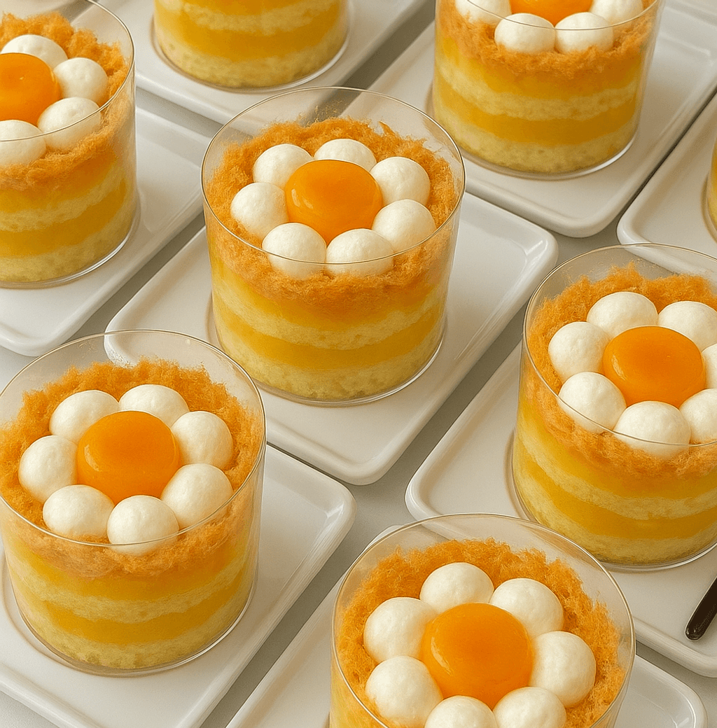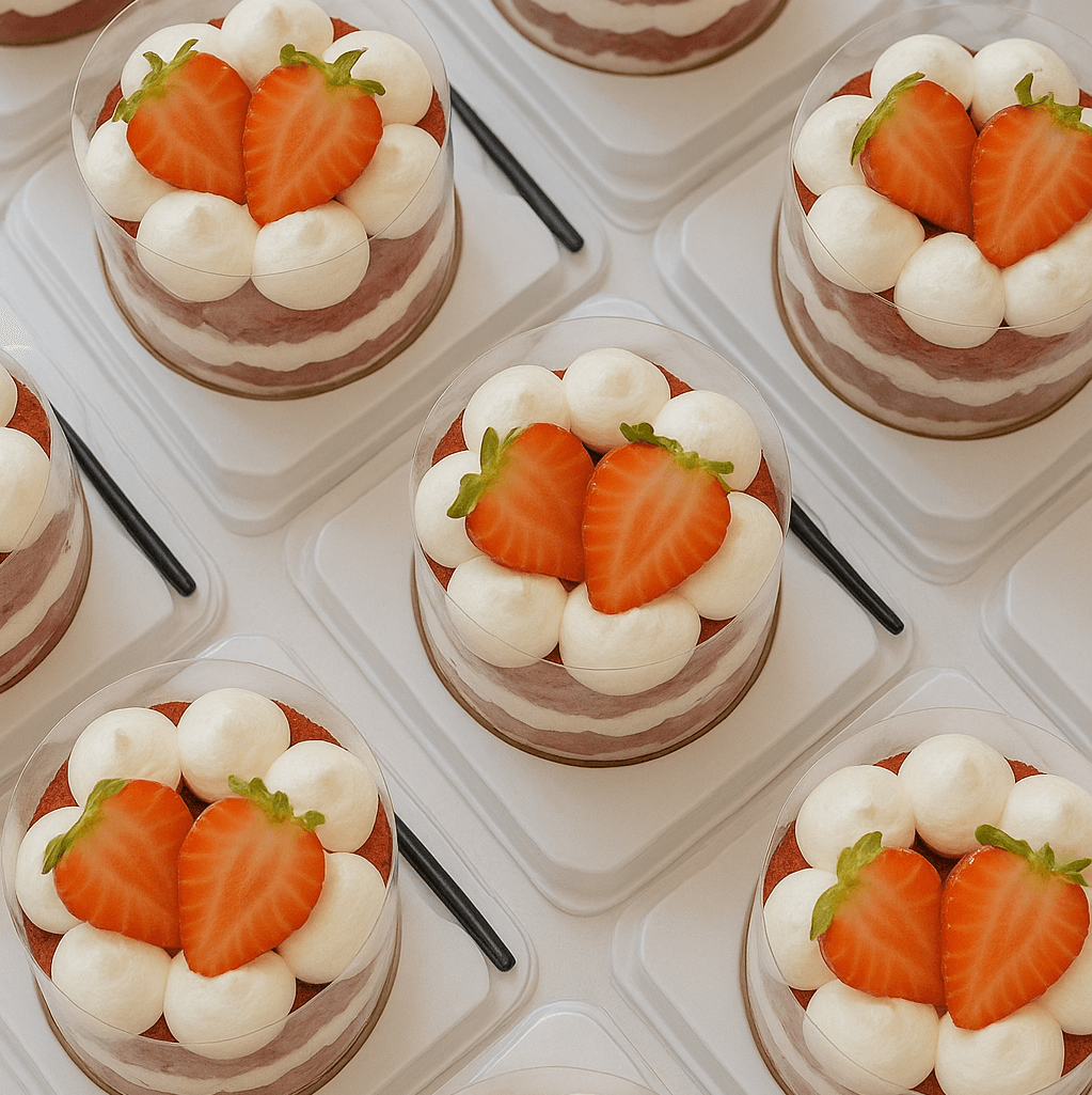 Một set 9 cốc chia đều 3 vị: dâu tây, xoài và sữa chua, kết hợp cùng cốt bánh vani, bên trên trang trí hoa quả tươi: dâu, xoài, nho xanh. Thích hợp các buổi tiệc vừa, đáp ứng khẩu vị khác nhau của các thành viên. 4.2x4.2x4.8cm/cốc
