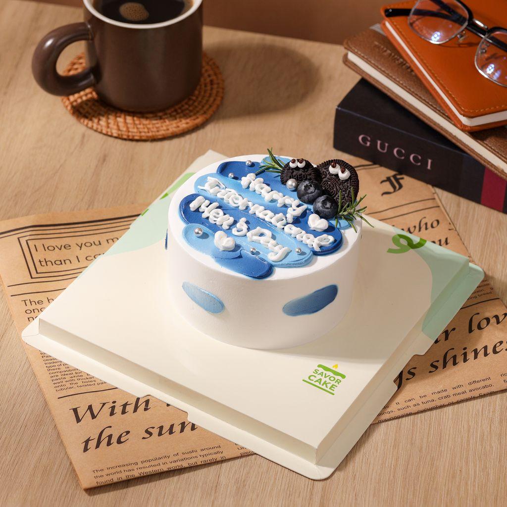Bánh kem cốt vani, mứt việt quất, kết hợp cùng kem trắng, phía trên mặt bánh tạo hình những vệt kem xanh loang màu đan xen, trang trí thêm việt quất và bánh quy oreo cùng kẹo bi bạc