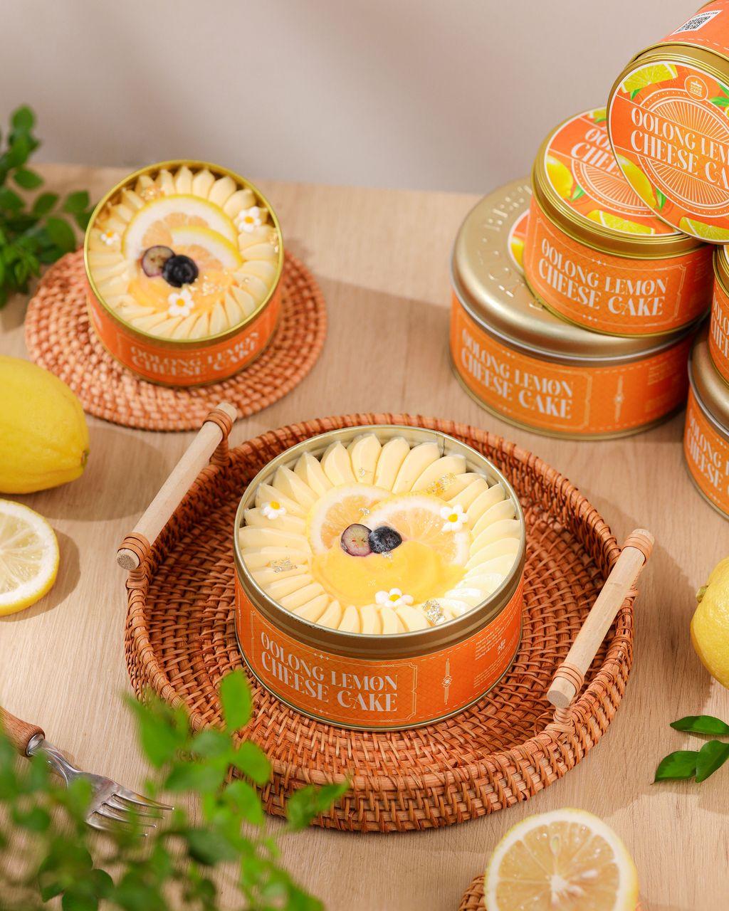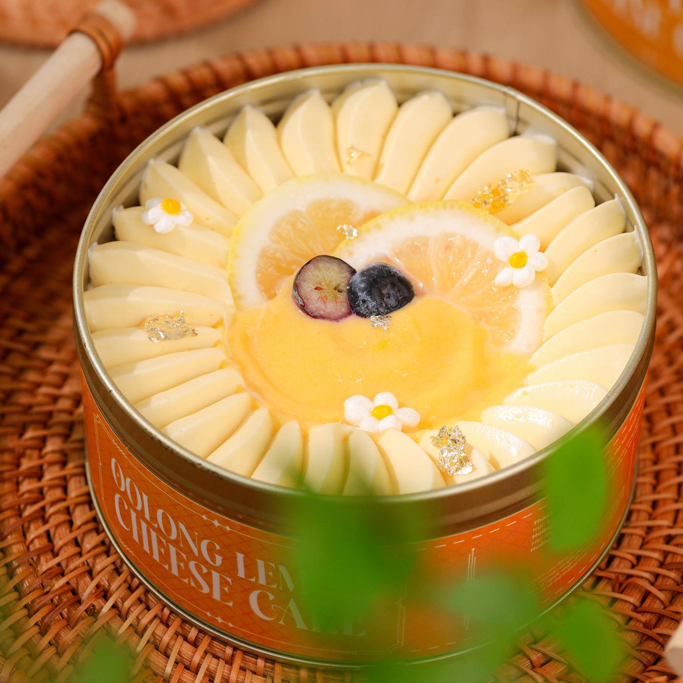 Oolong Lemon Cheese Cake gồm hai lớp cốt ô long nhài mềm ẩm, mang hương trà thanh tao và nhẹ nhàng. Xen giữa là lớp kem phô mai chanh vàng hòa quyện từ whipping cream và cream cheese mịn mượt. Nhân bánh được điểm xuyết bằng sốt chanh vàng chua ngọt chuẩn vị, kết hợp cùng trân châu ngọc trai dai giòn, mang đến cảm giác tương phản độc đáo và trang nhã. Phần mặt bánh được hoàn thiện tinh tế với lát chanh vàng tươi, việt quất mọng nước và lá vàng, tạo nên vẻ đẹp hiện đại, sang trọng và đầy cuốn hút.