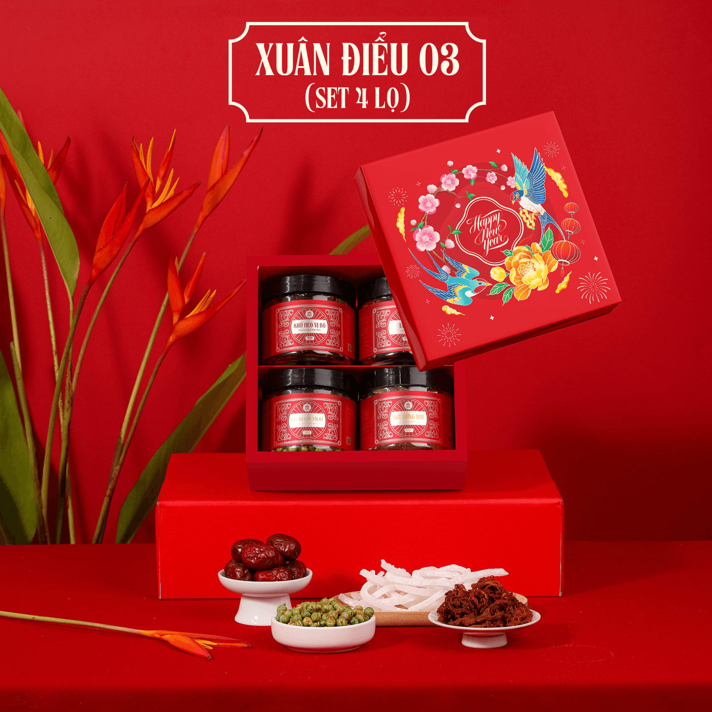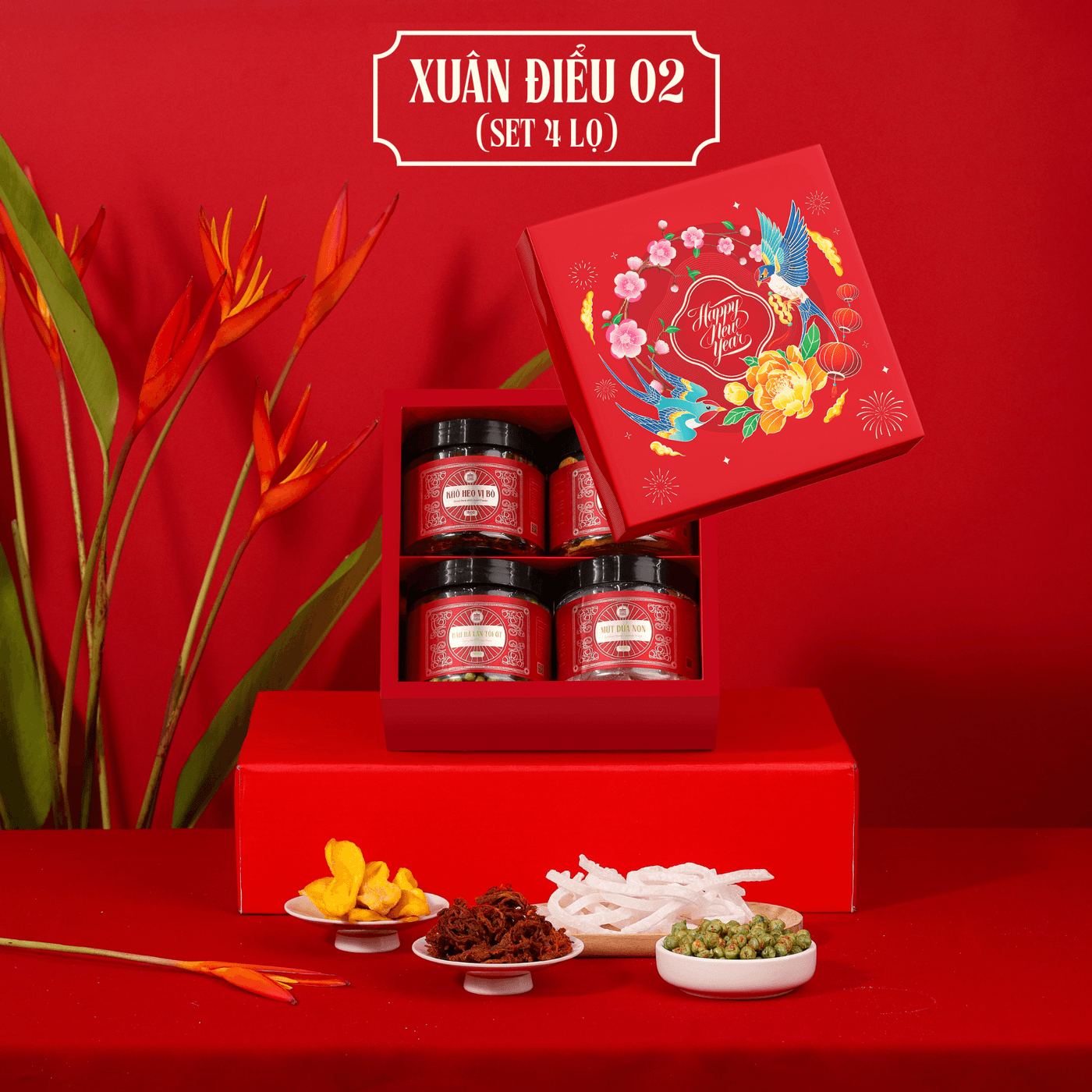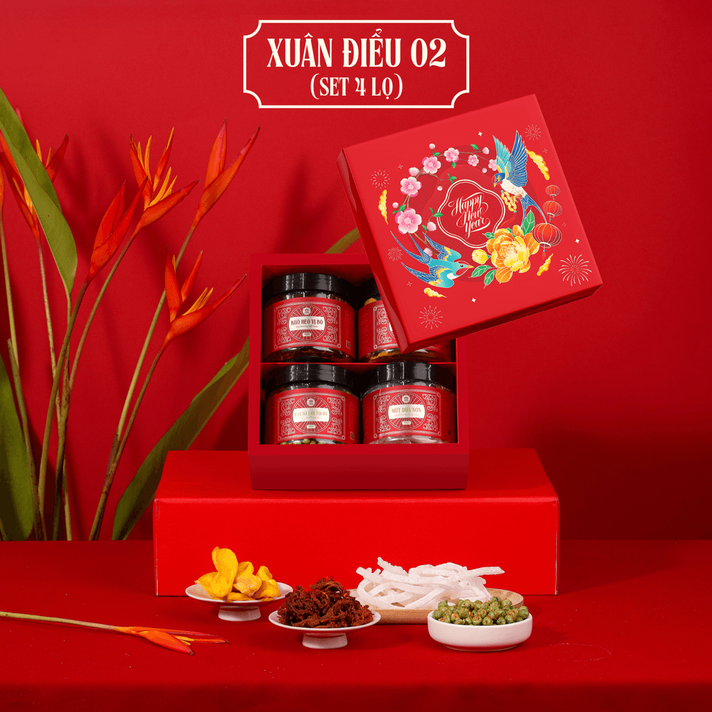 1 chai vang Pháp Morange 750ml + 12 hũ: hạnh nhân Mỹ rang bơ,Trà Ô Long Thanh Hương 75g, xoài sấy dẻo x2, cookie rong biển, khô heo vị bò x2, Kẹo nougat sữa hạt, hồng táo sấy dẻo, đậu Hà Lan tỏi ớt, mứt gừng Huế, mứt dừa non.